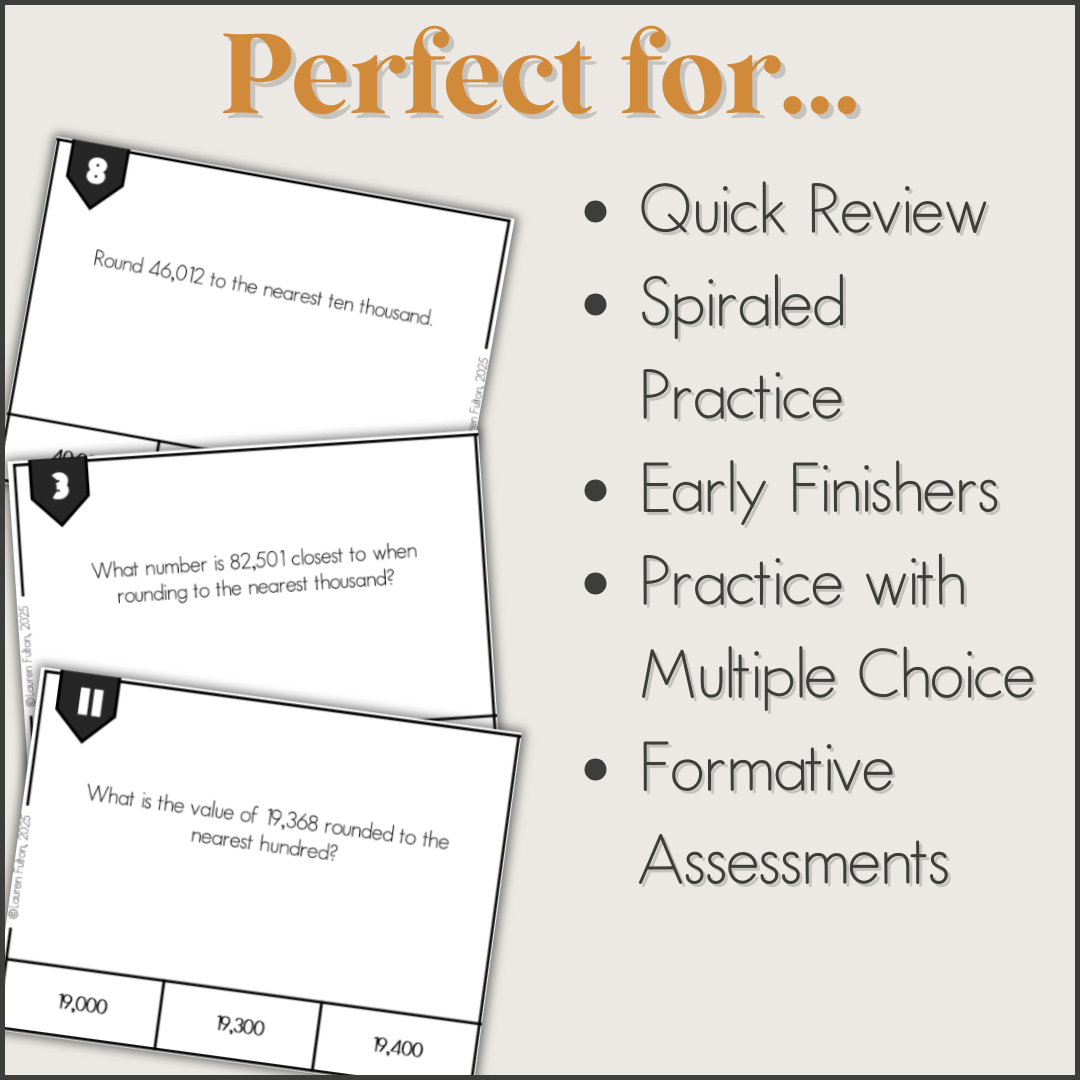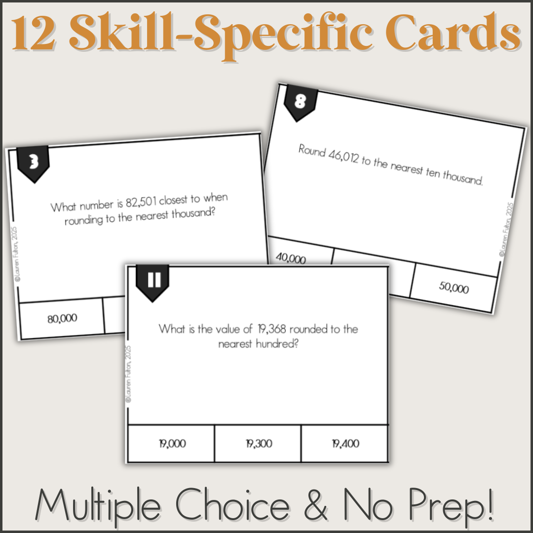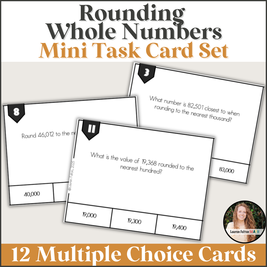 ✔️ 12 multiple-choice task cards, covering rounding whole numbers